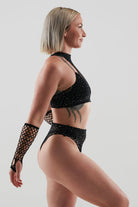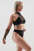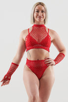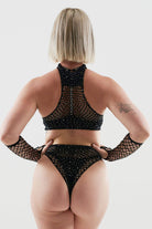Why settle for one piece when you can sparkle from every angle? Meet the Rhinestone Fishnet 4-Piece Set – serving looks and attitude with a matching top, booty shorts, gloves, and full-body shine.