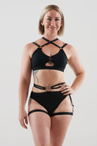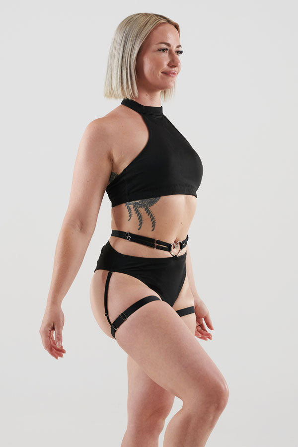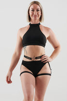 Model in black wearing Sydney Brazils Medium -We recommend you size up if you are in-between sizes - Barcelona Halterneck size S- This is generous sizing