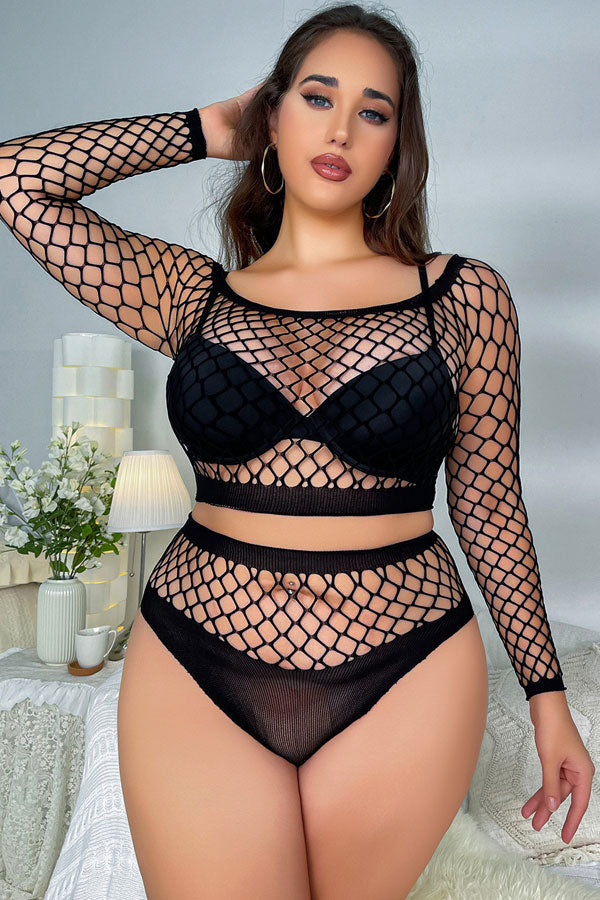 • Includes: Long-sleeve fishnet crop + matching high-waist bottoms