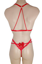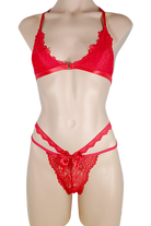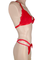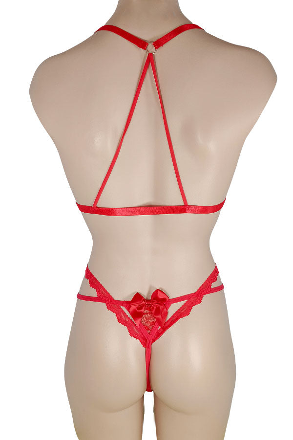 This fiery red duo brings pure temptation with soft lace, flirty bows on the back, and a daring but sexy v string bra back that leaves just enough to the imagination.